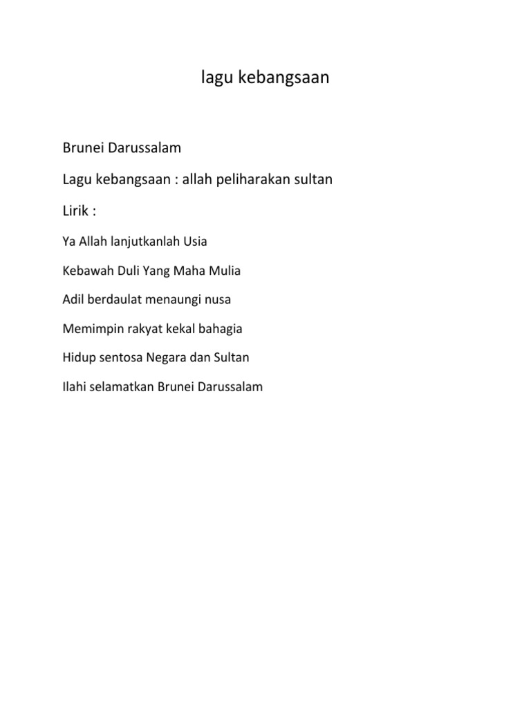 Lirik Lagu KebangsaanNational anthem. Kita bangunkan bangsaKita bina negaraMaju sejahteraBrunei DarussalamKemerdekaan dan kedaulatanMenuntut pengorbanan. Ilahi selamatkan Brunei Darussalam.